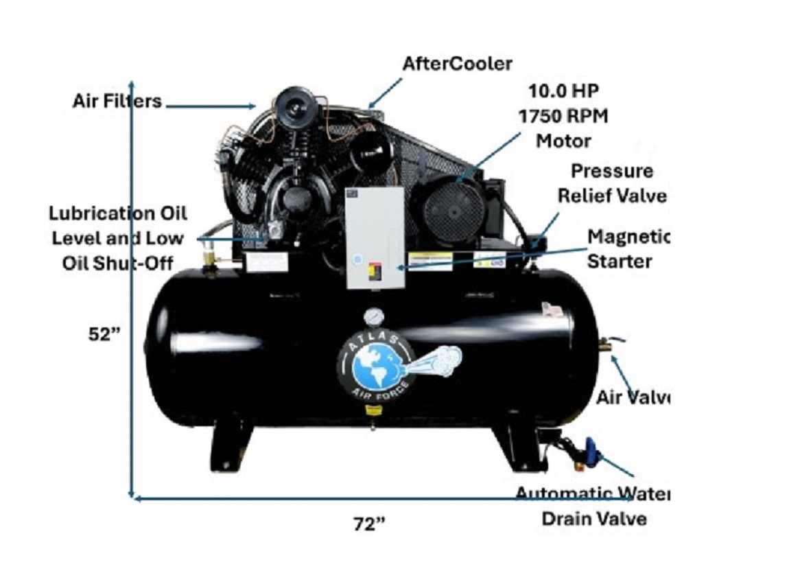 This version of the Atlas® Air Force AF10 is 220volt SINGLE (1) Phase electric. The AF10 is a heavy duty, commercial grade compressor that is perfect for large automotive repair or body shops looking for the most air possible. The Atlas® AF10 comes standard with the air compressor “PLUS PACKAGE.” The “PLUS” features for our commercial grade two stage air compressors include an automatic low oil monitor, automatic tank drain, and air-cooled aftercooler. These three features help to extend the life of your Atlas® air compressor while also delivering “better air”. The AF10 also comes standard with the added capacity of an oversized 120 Gallon horizontal tank.