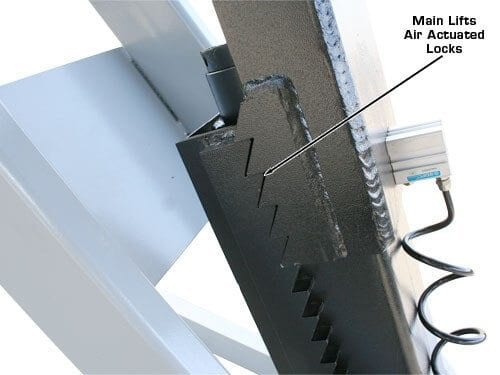 Welded rails on the inside of the runways are standard on all lifts, allowing the bundled Atlas® RJ-6 (6,000 lbs. capacity) air/hydraulic rolling jack system on his Atlas® alignment scissor lift. The Atlas® RJ-6 is designed and engineered to operate on “delivered” air pressure of between 70-105 PSI.