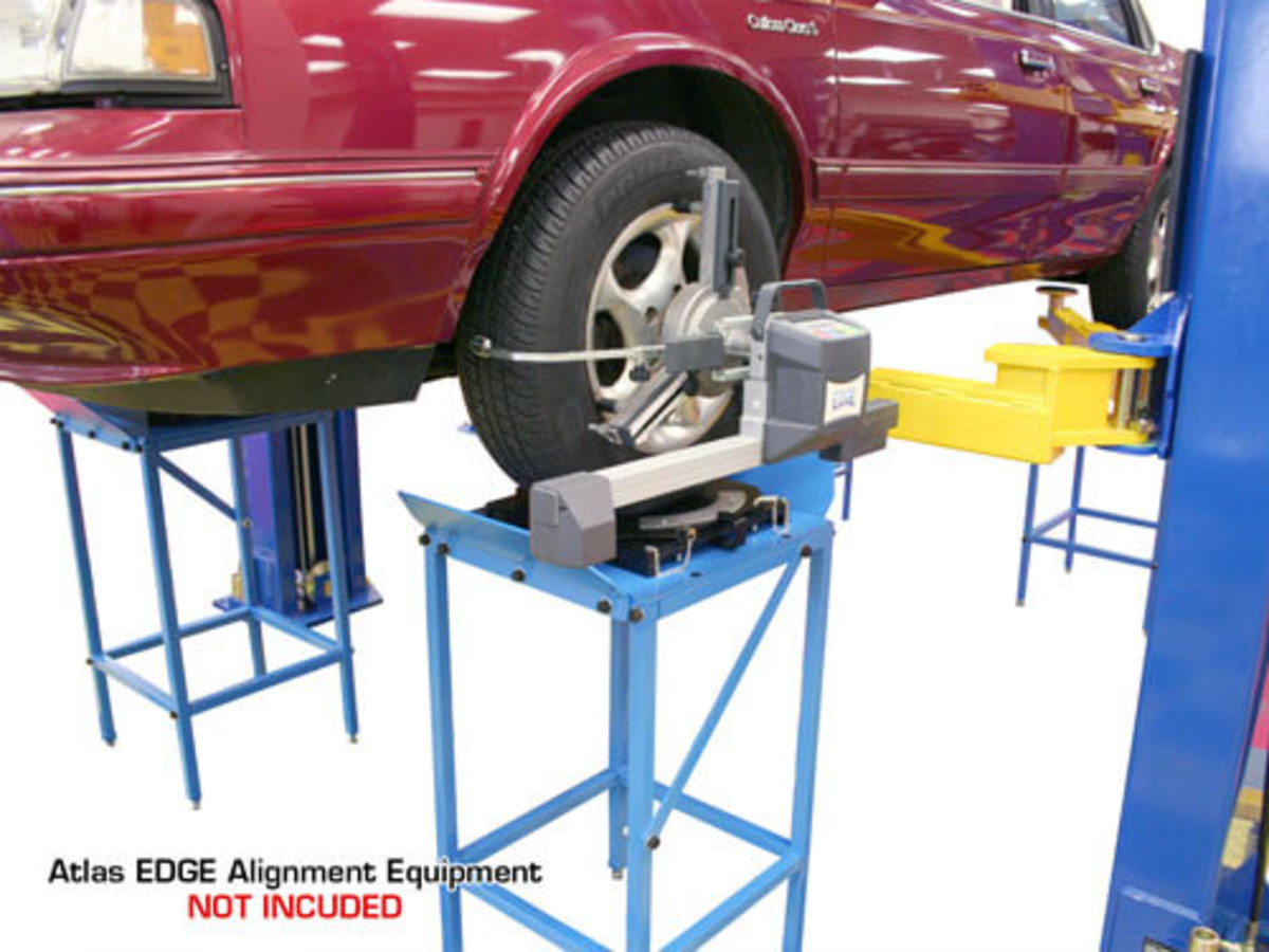 The Atlas® Wheel Stands are the perfect choice for those smaller shops who want the advantages of a four post lift but have only limited floor space. The set of Atlas® Wheels Stands can support up to 6,000 lbs. and, because they are taller than most other stands, are the perfect height for hanging wheel alignment sensors. Many shops do not have room for a dedicated four post alignment lift. These shops may have only two post lifts or midrise lifts in their existing facility. The Atlas® Wheel Stands can be adjusted (leveled) so that they can be used for wheel alignment. Simply place a turntable on each wheel stand and your two post lift has been transformed into a four post alignment lift. Use the arms of your two post lift (or mid-rise lift) to raise the vehicle to perform lateral run-out compensation for your sensors or to make adjustments on the front or rear ends. The Atlas® Wheel Stands are also perfect for undercar service including exhaust and suspension adjustments and installations.
