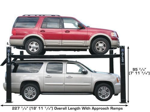 The Atlas® Garage PRO9000 4 post lift is a heavy-duty hobbyist lift and features the highest lifting capacity of all our Garage PRO series lifts. The Garage PRO9000 is extra-long and has the longest runways (we believe) of any portable 9,000 LB. four post on the market. That feature allows the lift to handle some of the longest wheelbase vehicles out there. The Garage PRO9000 is extra wide allowing even Diesel Duallys to be driven onto the runways. This lift also features extra height so everything from Smart Cars® to a Dually can be parked both below and on the runways.