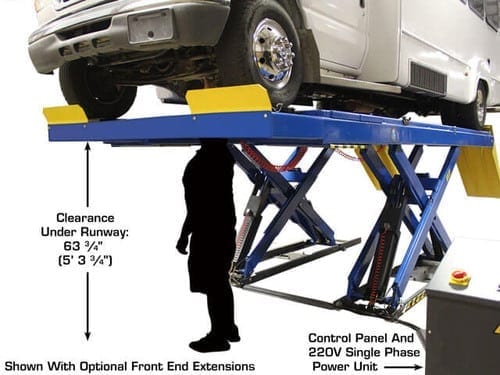 The Atlas® PX16A includes a set of turntables, built in slip-plates, and runway jack rails designed to accommodate optional rolling jacks (like the Atlas® RJ8000BK). The lift is equipped with a semi enclosed air line kit routing system to accommodate the optional airline kit. This air line kit will provide air to the rolling jacks and prevent shop air hoses from cluttering the floor.